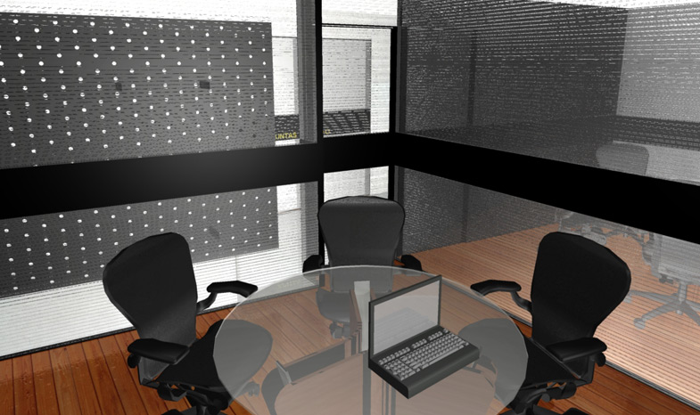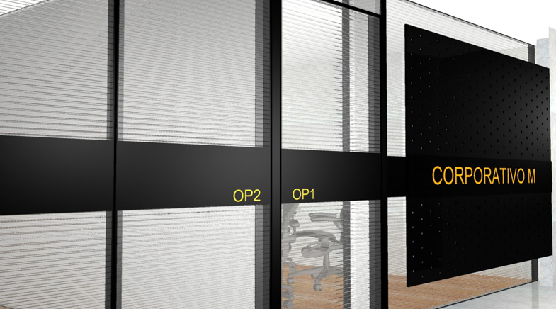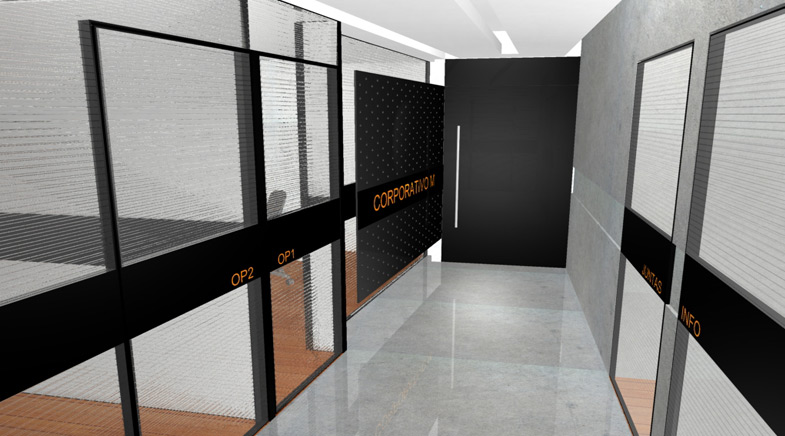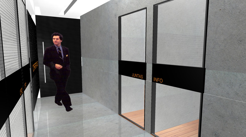 (2004) Diseño de Interiores de un corporativo de software en el DF, al contar con un espacio limitado se buscó integrar las oficinas a través de un corredor cuya única separación son mamparas translúcidas de policarbonato. La delimitación de los espacios de trabajo y de circulación se genera con cambios de piso consistentes en duela de madera y cemento pulido.